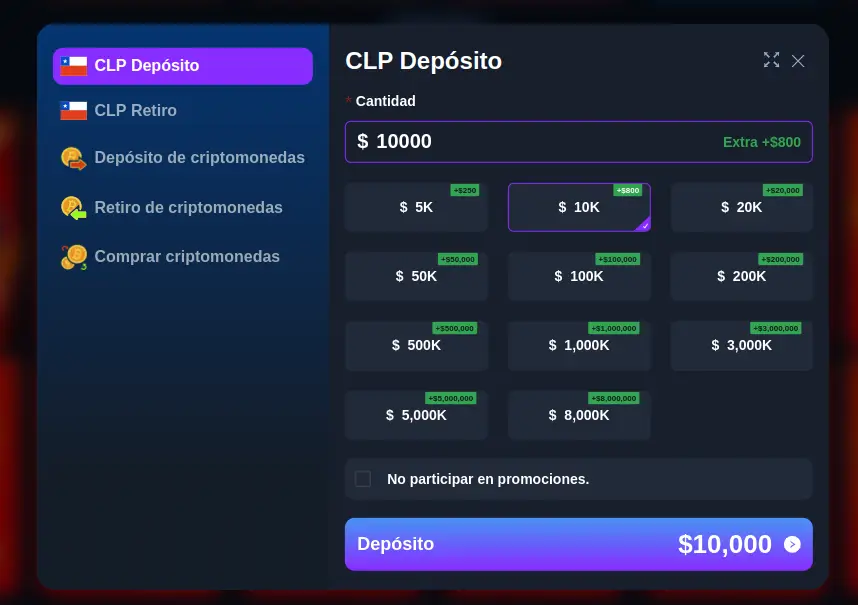 El requisito de depósito mínimo se establece en 5 euros, mientras que el importe mínimo de retirada es de 10 euros o su equivalente en CLP. Además, los términos y condiciones del casino mencionan la posibilidad de cobrar una comisión de hasta el 8% en los retiros. En comparación con los estándares del sector, esta comisión es relativamente alta y podría disuadir a posibles jugadores.