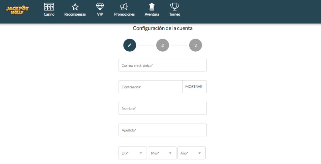 Para comenzar, el acceso a la página principal de Jackpot Molly revela un diseño limpio y una interfaz intuitiva, lo cual es un punto a favor para los usuarios nuevos que podrían sentirse abrumados con procesos complicados. El botón de “Registrar” es claramente visible y dirige a un formulario que se completa en tres pasos breves, optimizando así el tiempo del usuario.