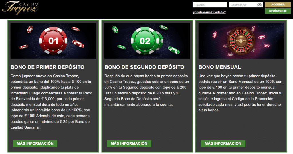 Aunque los detalles específicos pueden variar, Casino Tropez ocasionalmente ofrece bonos sin depósito. Este tipo de bonificación es ideal para los jugadores que quieren probar juegos sin riesgo antes de invertir dinero real.