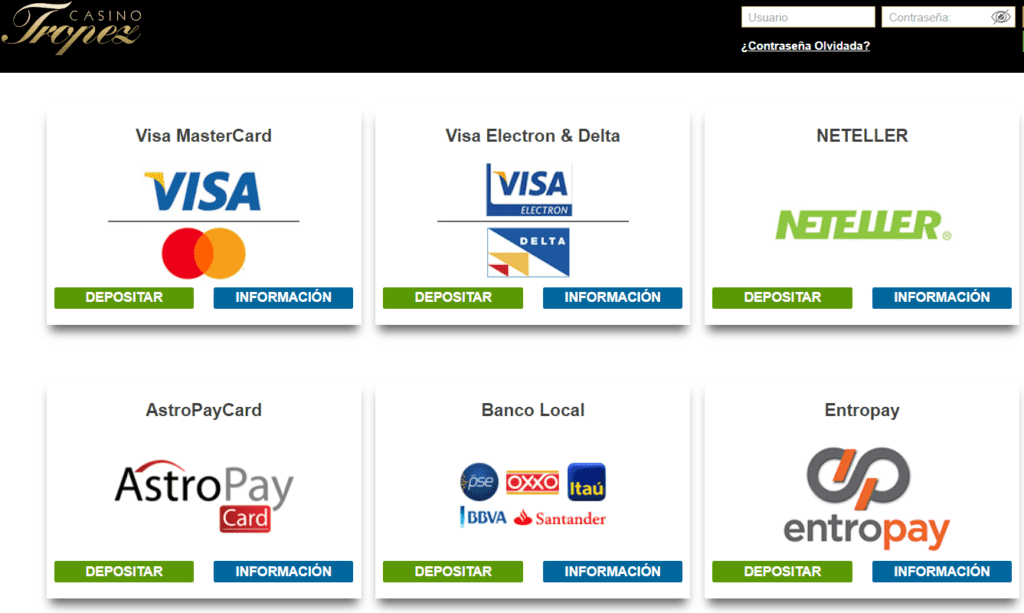 Casino Tropez ofrece una variedad razonable de 26 métodos de pago, incluyendo: