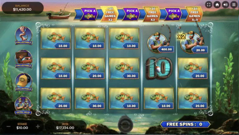 - 🌟 Pescador Pegajoso: Como su nombre indica, este símbolo permanece en los rodillos durante los giros gratis, aumentando las posibilidades de formar combinaciones ganadoras y obtener premios mayores.