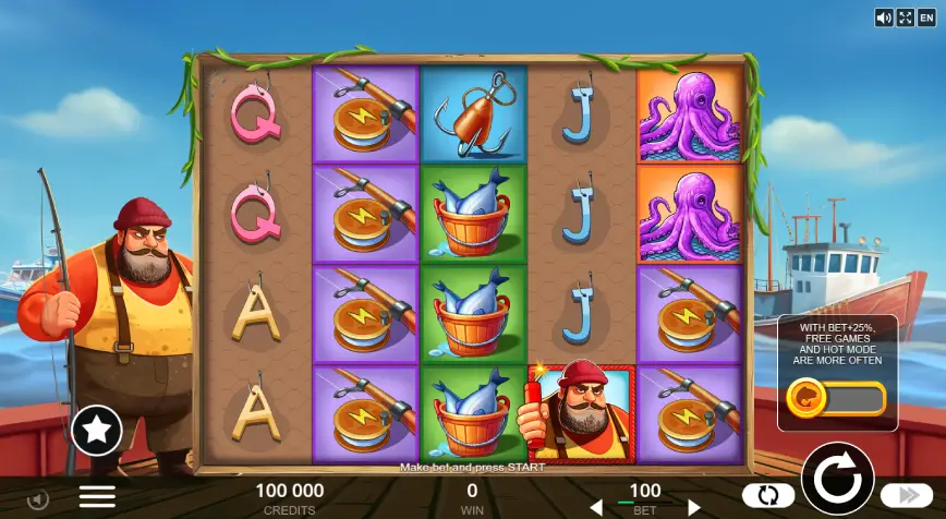 La trama de Blast the Bass se despliega en un entorno marino vibrante y dinámico. Los jugadores son llevados a bordo de un barco pesquero balanceante, donde los carretes aparecen rodeados por gaviotas volando sobre el vasto océano. Esta ambientación no solo es visualmente atractiva, sino que también sumerge completamente a los jugadores en la experiencia de juego. La presencia del capitán, con sus dos dinamitas listas para lanzar al mar, simboliza la acción y el ritmo acelerado del juego. Este entorno marino no solo es un deleite para los ojos, sino que también establece el tono para las mecánicas de juego innovadoras y las posibilidades de ganar grandes premios.