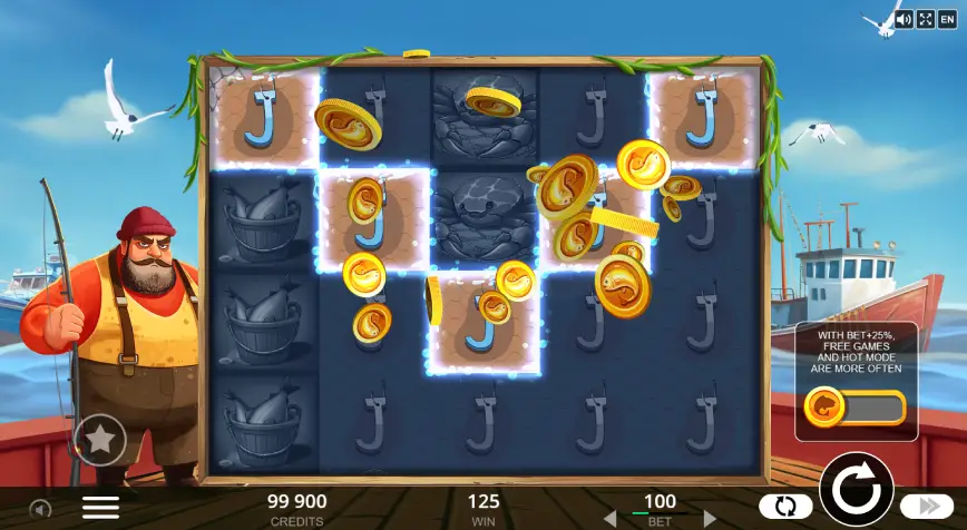 - 🌟 Símbolo Wild (Capitán): Este comodín no solo ayuda a crear líneas ganadoras, sino que también recoge todos los valores de los símbolos de Crédito y las monedas de Pez presentes en los carretes.