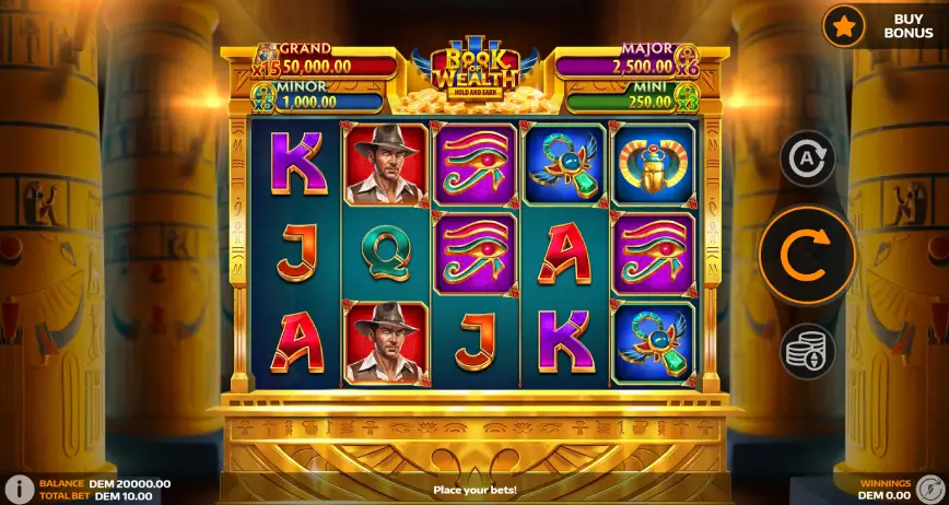 - 🎰 Juego de Bonificación del Jackpot: Se activa al obtener 3 o más símbolos de Libro. Los jugadores comienzan con 3 respins, y cada nuevo Scatter resetea el contador de respins a tres, aumentando las posibilidades de obtener jackpots.