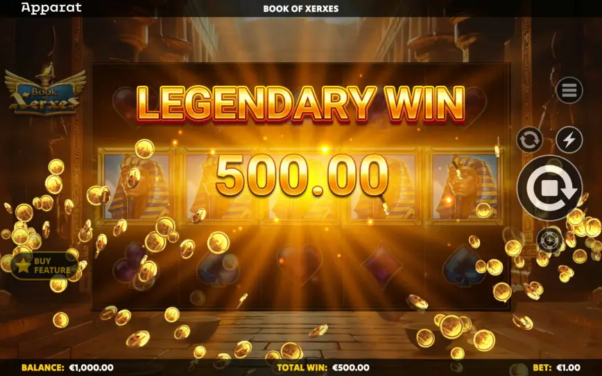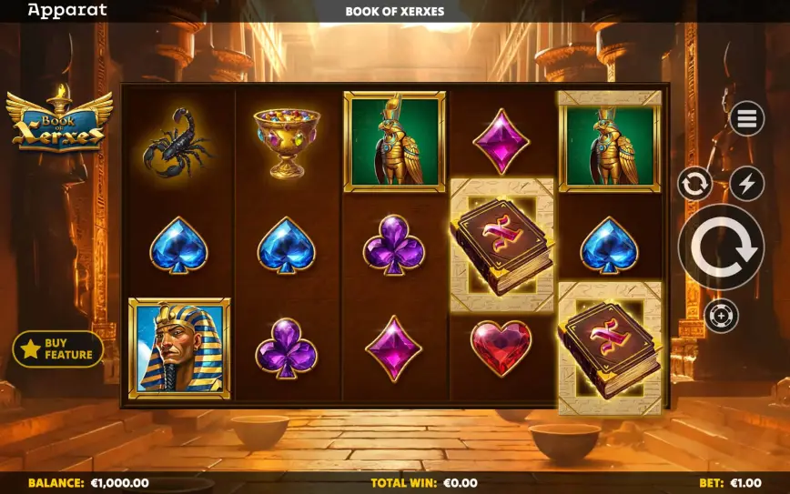 ¿No quieres esperar a que caigan los tres libros? Buena noticia: Book of Xerxes incluye la opción de comprar directamente la función de giros gratis por 90 veces tu apuesta.