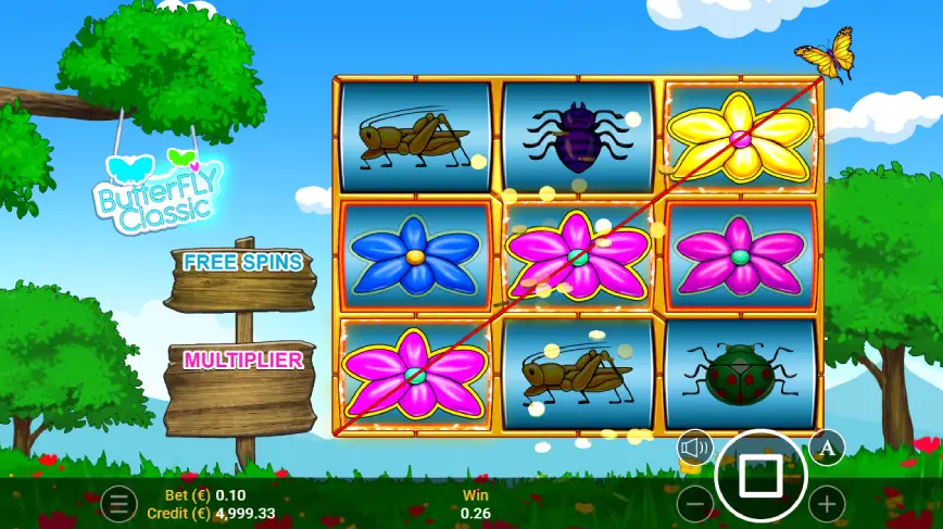 En Butterfly Classic, los símbolos especiales juegan un papel fundamental. Las mariposas, en particular, son icónicas y representan los símbolos de mayor valor. Además, el juego incluye otros símbolos importantes como las libélulas y los saltamontes, que también pueden proporcionar recompensas significativas. Las flores, aunque son símbolos de menor valor, ofrecen ganancias frecuentes para mantener el equilibrio del juego.