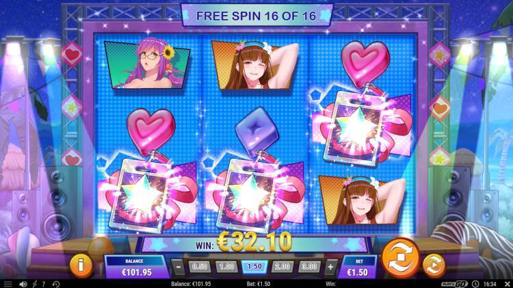 - 🍬 Candy Splash: Se activa cuando se obtiene una victoria de 3 en su tipo con una de las concursantes, expandiendo el símbolo para cubrir los 3 carretes y otorgando un pago completo en las 5 líneas de pago.