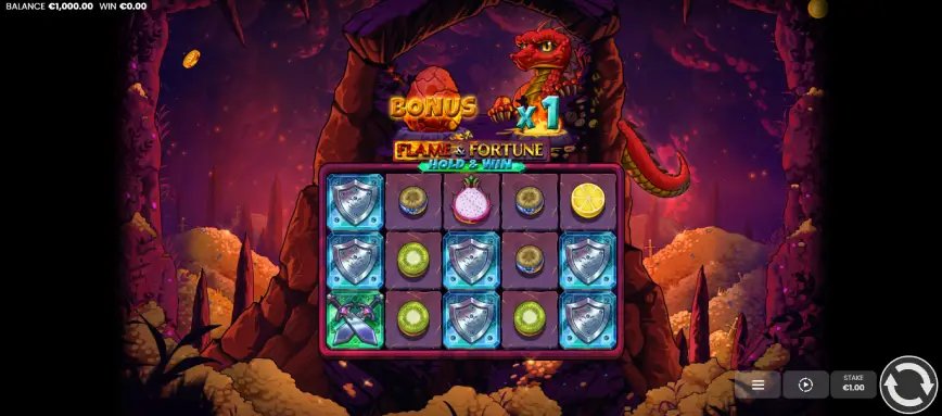 La narrativa de Flame and Fortune: Hold & Win se centra en la búsqueda de riquezas, con símbolos que incorporan una variedad de frutas como ciruela, kiwi, cítricos, fruta del dragón y sandía para los pagos bajos. Para los pagos altos, encontramos símbolos como un escudo de plata, espadas y una copa dorada, cada uno representando un aspecto de la búsqueda de tesoros. Esta combinación no solo enriquece la historia del juego sino que también ofrece diversas oportunidades para ganar, lo que es crucial para mantener el interés del jugador.