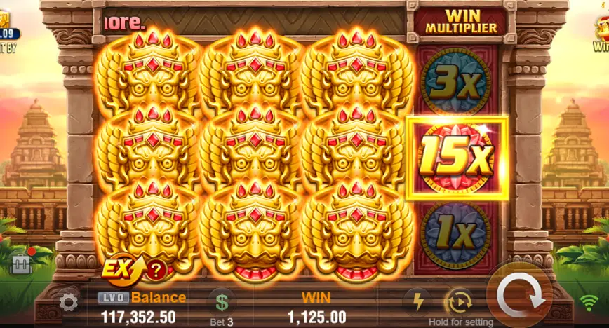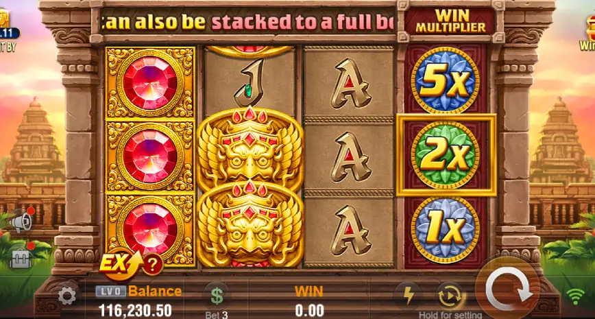 El contexto cultural está fuertemente influenciado por el arte tradicional de Camboya, particularmente visible en los detalles escultóricos y la arquitectura que adornan los carretes y el fondo del juego. Un elemento intrigante es la presencia de un pájaro dorado engastado con rubíes, que parece estar inspirado en el Garuda de la mitología india, símbolo de éxito y prosperidad. Esto añade un nivel de profundidad y autenticidad a la temática del juego, haciendo que cada giro sea una inmersión en una rica tapeza cultural.