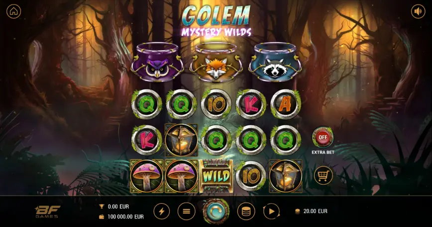 Esta bonificación te da 10 tiradas gratis en Golem Mystery Wilds. Cada vez que aparece un Wild, se convierte en un búho gigantesco que se expande verticalmente, cubriendo todo el carrete en el que aterriza (excepto el cuarto). Esto puede generar combinaciones en múltiples líneas al mismo tiempo. La animación del búho descendiendo desde las copas de los árboles es impresionante y crea momentos verdaderamente épicos.