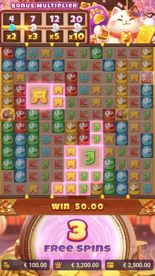 Happy Neko ofrece una estructura de juego única con 8 carretes en el juego principal y 12 en el juego de bonificación gratuito. Esta configuración poco convencional permite una mayor variedad de combinaciones ganadoras, lo que puede ser particularmente atractivo para jugadores que buscan algo diferente de las tragamonedas más tradicionales. Además, al obtener 5 o más símbolos SCATTER, los jugadores pueden activar el juego de bonificación gratuito, donde los símbolos ganadores se fusionan en un gran símbolo, aumentando la posibilidad de grandes ganancias.