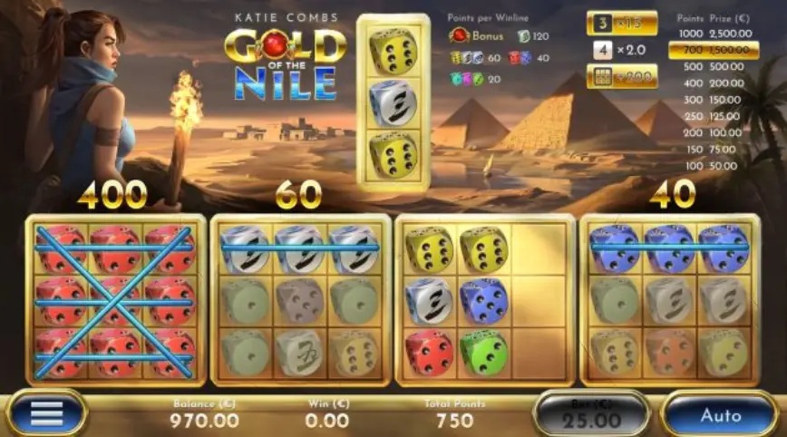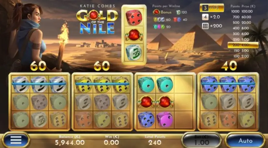 La estructura de Katie Combs: Gold of the Nile se basa en un formato de carretes tradicional, pero con innovaciones que la hacen destacar. Los jugadores encontrarán símbolos como dados de rubí rojo que activan el emocionante bonus de CAZA DEL TESORO. Este bonus permite a los jugadores guiar a Katie en su camino a través de las tumbas, eligiendo su próximo movimiento y recogiendo artefactos preciosos que se convierten en puntos de dinero.