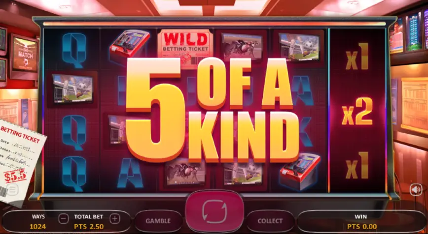 - 🎰 Símbolos de alto valor: Incluyen pantallas de carreras de caballos y fútbol, junto con apostadores y empleados de la casa de apuestas, todos presentados con un estilo visual atractivo.