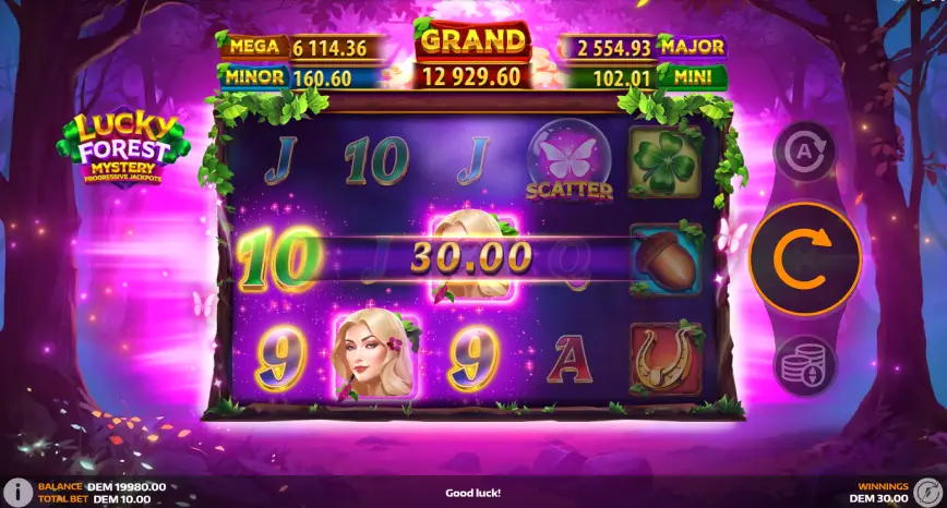 Desde el primer giro, Lucky Forest transporta a los jugadores a un mundo de fantasía, donde cada árbol y cada sombra pueden esconder un secreto. El diseño del juego captura perfectamente la esencia de un bosque místico, con gráficos que evocan imágenes de cuentos de hadas y una atmósfera que invita a la exploración y el asombro. Este entorno no solo es visualmente atractivo, sino que también proporciona un telón de fondo perfecto para la acción emocionante que se desarrolla en el juego.