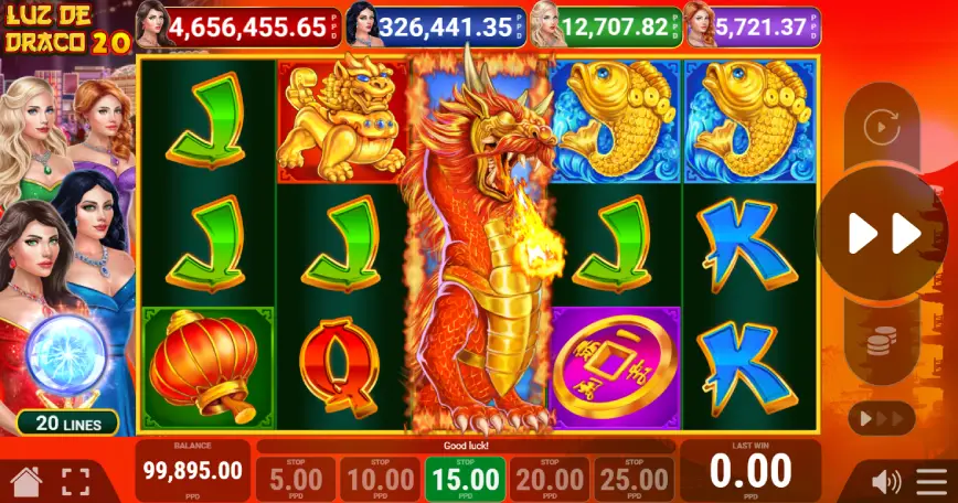 Gráficos, sonidos y animaciones de tragamonedas Luz de Draco 20
