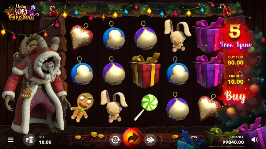 La interactividad en Merry Scary Christmas es uno de sus puntos fuertes, ofreciendo una jugabilidad que es tanto intuitiva como atractiva. Los controles son fáciles de usar, lo que permite a los jugadores ajustar rápidamente sus apuestas y girar los carretes sin complicaciones. Para aquellos que son nuevos en el mundo de las tragamonedas, esta facilidad de uso es particularmente atractiva, ya que reduce el tiempo necesario para familiarizarse con el juego.