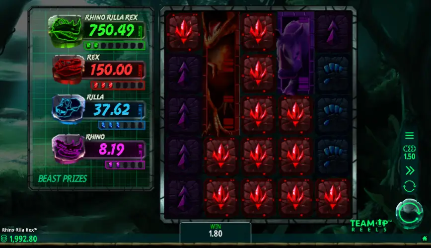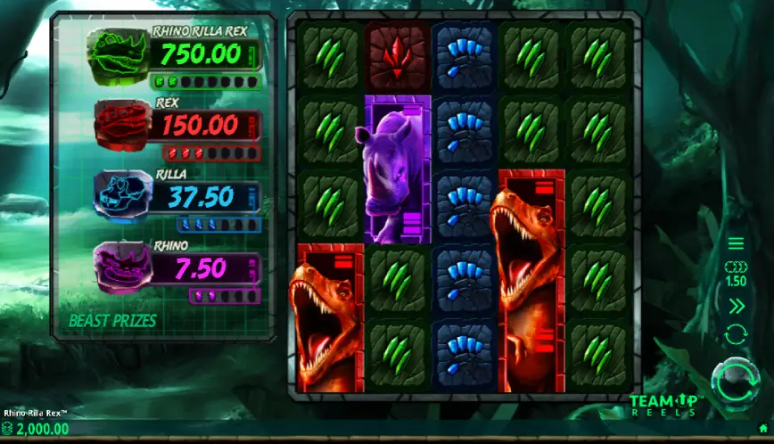 La función Team Up es uno de los atractivos principales de Rhino Rilla Rex. Esta se activa cuando una combinación de símbolos premium de bestias aparece completamente visible en los carretes. Lo interesante de esta función es que los símbolos activadores forman un nuevo tablero de juego, donde pueden aparecer premios en efectivo, multiplicadores o fichas. Los jugadores tienen un giro para obtener la suma total de todos los premios en efectivo visibles, aumentada por los multiplicadores si uno o más de ellos aparecen. Estos multiplicadores varían entre x2 y x5, dependiendo de los símbolos de animales que activaron la función. Es fascinante cómo el juego combina las bestias activadoras en un híbrido, como un Rhino-Rilla, añadiendo un toque de creatividad.