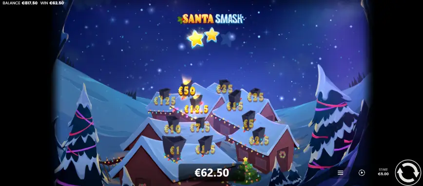 Otra función interesante es el Free Smash. Cada vez que Santa vuela por la pantalla, activa uno de los tres sectores de scatter (estrellas). Cuando los tres sectores están activos, el jugador recibe 10 Free Smashes, un tipo de giro gratis que aumenta las oportunidades de ganar sin invertir dinero adicional. Además, es posible obtener más Free Smashes durante esta función, lo que añade una capa extra de emoción y potencial de ganancias.
