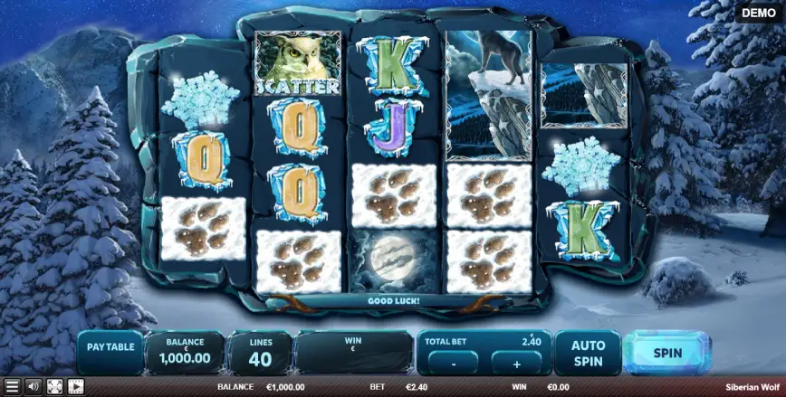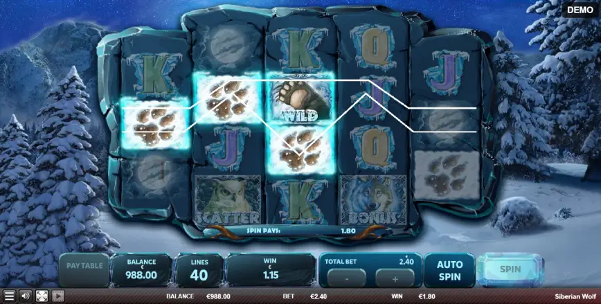Siberian Wolf cuenta con una configuración de 5 carretes y hasta 40 líneas de premio, ofreciendo combinaciones ganadoras en ambas direcciones. Esta característica no solo aumenta las posibilidades de éxito, sino que también añade una capa adicional de estrategia al juego. Los jugadores pueden ajustar su apuesta desde 0.16 hasta un máximo de 160.00 por giro, lo que permite una gran flexibilidad en el juego.