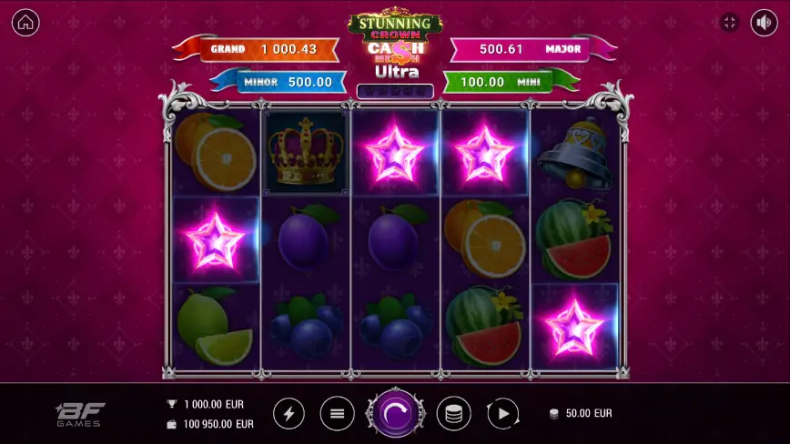 Stunning Crown Cash Mesh Ultra es una tragamonedas que combina lo mejor de los clásicos con mecánicas modernas y emocionantes. Con una cuadrícula de 5×3, 10 líneas fijas y un RTP del 96.06%, este título de BF Games ofrece funciones especiales como Wilds expansivos, la adictiva Cash Mesh con respins y hasta cuatro jackpots, incluyendo progresivos. Gracias a su volatilidad media, permite disfrutar de premios frecuentes sin sacrificar la emoción de grandes ganancias, que pueden alcanzar hasta 90.520x tu apuesta. Además, es accesible para todos los perfiles de jugador, con apuestas desde 0,10€, versión demo gratuita y total compatibilidad móvil. ¿Lo mejor? Cada giro puede acercarte a una jugada realmente épica.