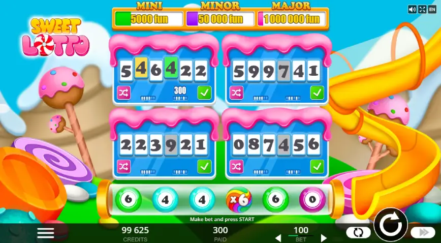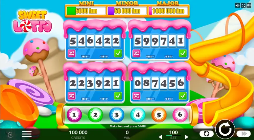 Una de las características que destacan en Sweet Lotto es la flexibilidad que ofrece al jugador. Puedes optar por cambiar los números de los cartones de forma manual o utilizar la función de selección rápida para un cambio aleatorio. Además, tienes la libertad de activar o desactivar los cartones según prefieras, lo que te permite ajustar el nivel de riesgo y la estrategia de cada ronda. Este control sobre el desarrollo del juego es especialmente atractivo para aquellos que buscan una experiencia de juego más dinámica y personalizada.