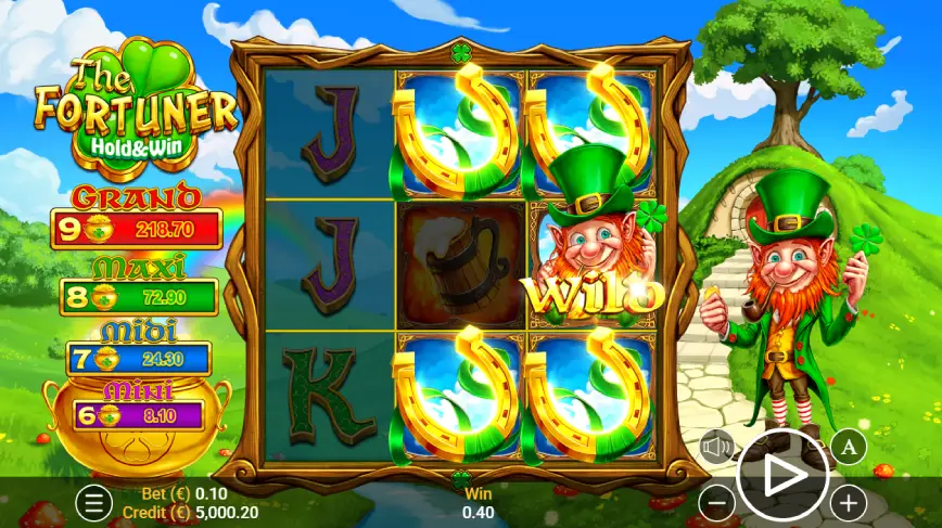 El encanto de The Fortuner: Hold & Win radica en su cuidadosa integración de elementos irlandeses clásicos. Desde los verdes colinas hasta los arcoíris dorados que adornan el fondo del juego, cada detalle está diseñado para sumergir al jugador en un mundo lleno de suerte y fortuna. Los tréboles de cuatro hojas y las herraduras son símbolos de buena suerte que no pueden faltar, y con la presencia del Leprechaun como el símbolo Wild, la experiencia se enriquece aún más con un toque de folklore y mística. Esta combinación convierte cada giro en una aventura hacia una tierra de legendarias riquezas y tesoros ocultos.