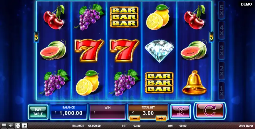 Ultra Burst presenta una variedad de símbolos tradicionales que son muy familiares para los entusiastas de las tragaperras. Entre estos símbolos se encuentran diamantes, campanas, números 7 en rojo, así como una serie de frutas como cerezas, limones, sandías y uvas. Cada uno de estos símbolos no solo aporta al atractivo visual del juego, sino que también desempeña un papel fundamental en la generación de combinaciones ganadoras, influyendo así en las recompensas que pueden obtenerse.