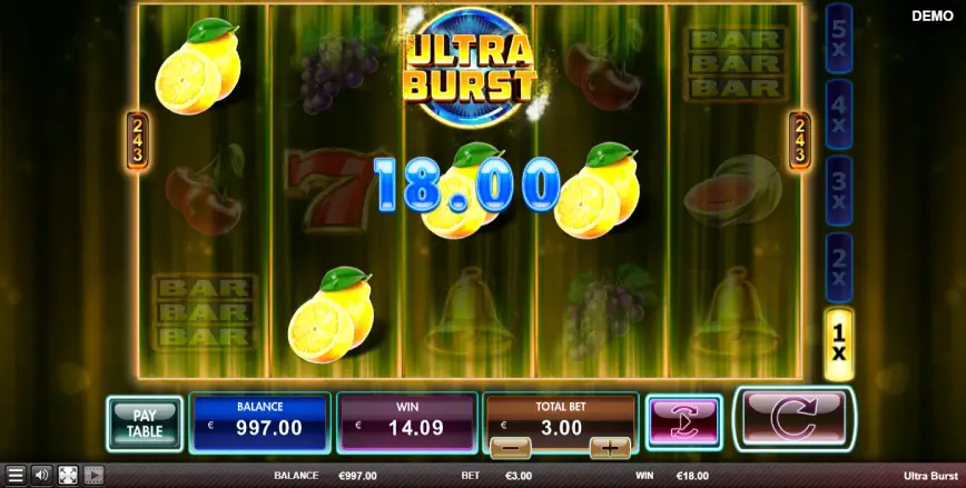 Una de las características más notables de la tragamonedas es la función «Ultra Burst». Esta característica especial transforma las líneas de pago tradicionales, proporcionando una oportunidad adicional para ganar con la inclusión de carretes en cascada y 243 formas de ganar cuando el símbolo “Ultra Burst Wild” forma parte de una combinación ganadora. Cada victoria adicional lanza un nuevo giro, aumentando potencialmente las recompensas gracias al multiplicador que puede llegar hasta x5, haciendo de esta función una emocionante adición al juego.