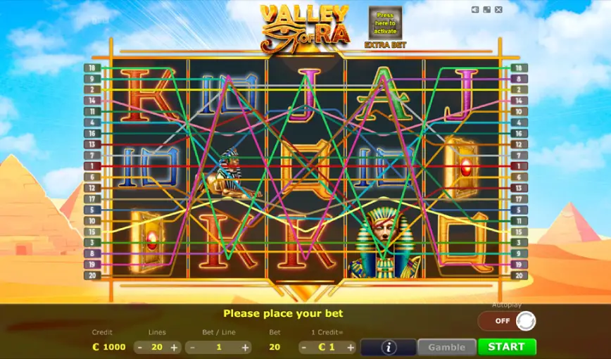 Valley of Ra presenta una configuración clásica pero efectiva que incluye 5 rodillos y un conjunto variable de líneas de pago, lo que permite a los jugadores ajustar su estrategia de juego según su presupuesto y preferencias. Esta flexibilidad en la estructura del juego es una característica importante que permite a todos los jugadores disfrutar del juego.