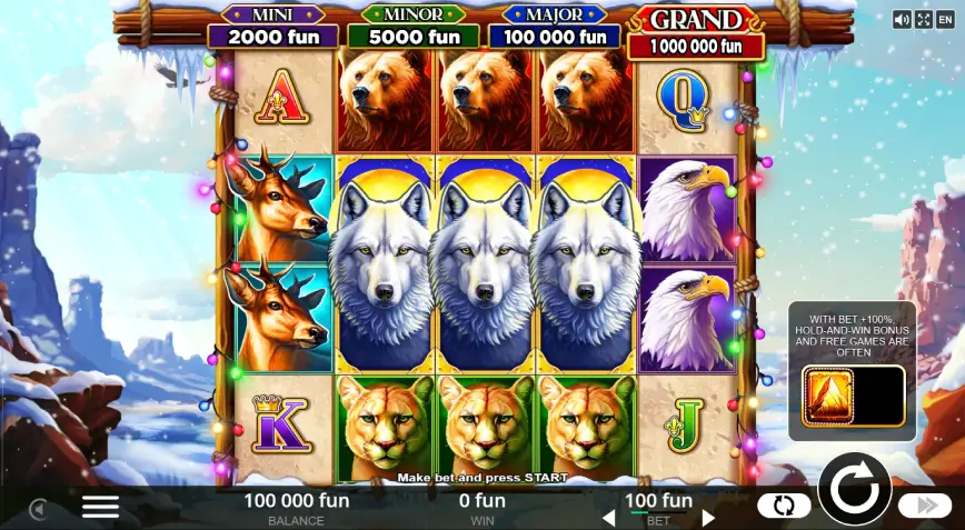 - 🎰 Conozca el juego: Familiarícese con los símbolos y las funciones especiales del juego. El lobo blanco es el símbolo Wild, sustituyendo a otros símbolos y cubriendo dos posiciones de los rodillos, lo que incrementa sus posibilidades de formar combinaciones ganadoras.