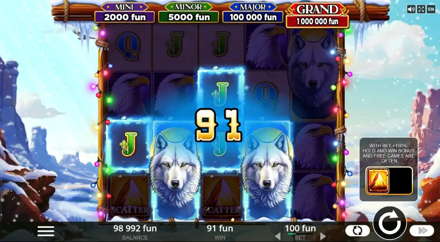 En Winter Thunder, los símbolos especiales juegan un papel crucial en el desarrollo de las partidas. El lobo blanco es el símbolo Wild, el cual puede sustituir a otros símbolos, potenciando las combinaciones ganadoras. Este símbolo cubre dos posiciones de los rodillos, y si aparece solo una parte, el rodillo continuará girando hasta que se complete. Por otro lado, el símbolo Scatter, representado por la montaña nevada, es el responsable de activar las tiradas gratis. Al menos tres de estos símbolos en los rodillos son necesarios para iniciar esta emocionante ronda.
